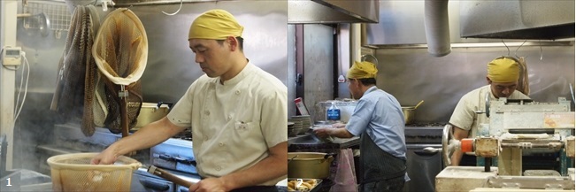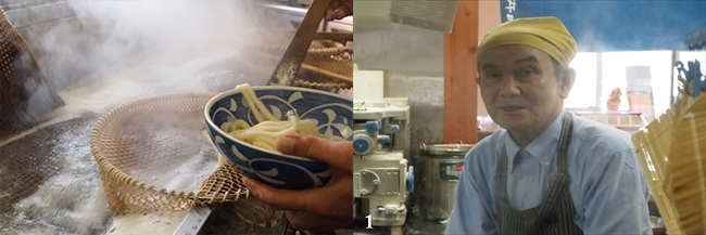 1. 岩店長を中心に、うどんの釜の前で長年、多くのご来客を迎え。いらっしゃいませ。