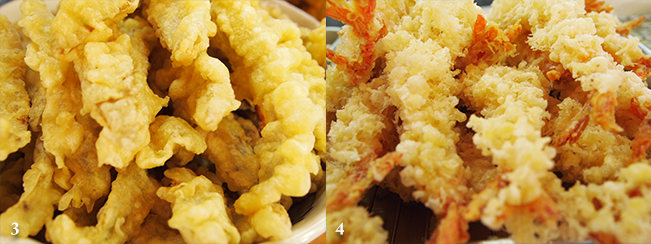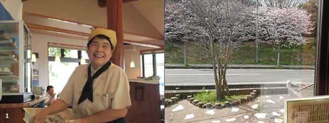 1. いつもの笑顔。2. 正面のおかち山、桜の頃 3.人気のごぼう天 4.やっぱりえび天