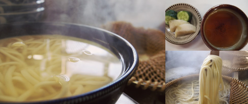 当店自慢の来夢の湯だめ(温・冷)は注文を受けてから茹でる細麺。約10分ほどお待ちください。 待ち時間にほうじ茶とお漬物が出ます。