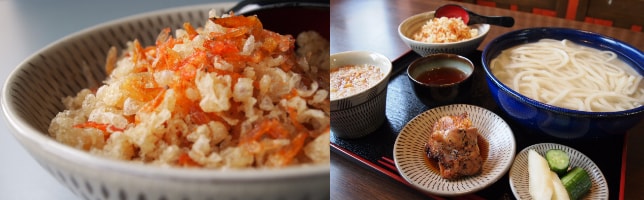 一度そのままだしを飲みながらで食べていただき、続けて海老天かすを入れ食べて下さい。だし好きには二度楽しんでいただけます。鶏の黒コショウ焼きも当店で焼き、煮切りをかけています(温泉玉子と入れ替えも出来ます)。単品490円。ご飯ものとセットにしても620円。時間がある方は是非お試しください。